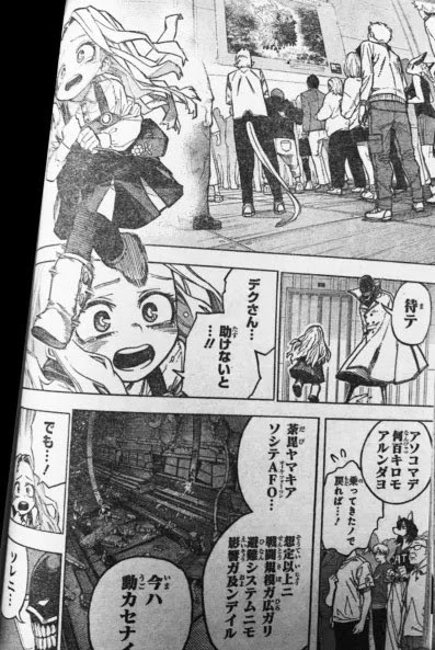 The chapter begins with Deku going for another attack. It cuts to Eri saying that she has to save Deku, but Ectoplasm tells her that he is hundreds of kilometers away. She suggests using the underground transportation system, but it’s been damaged by Dabi, Machia and AFO. Besides, she hasn’t gathered enough energy on her horn yet — even if she managed to get to him, she’d be useless. A while ago she tried to heal Aizawa’s eye and leg, but she couldn’t do it precisely because she lacked the energy. Ectoplasm understands how she’s feeling, but all they can do now is believe in Deku. We then see a flashback of Eri telling Deku her dream, which makes him very happy and motivated to do even better.