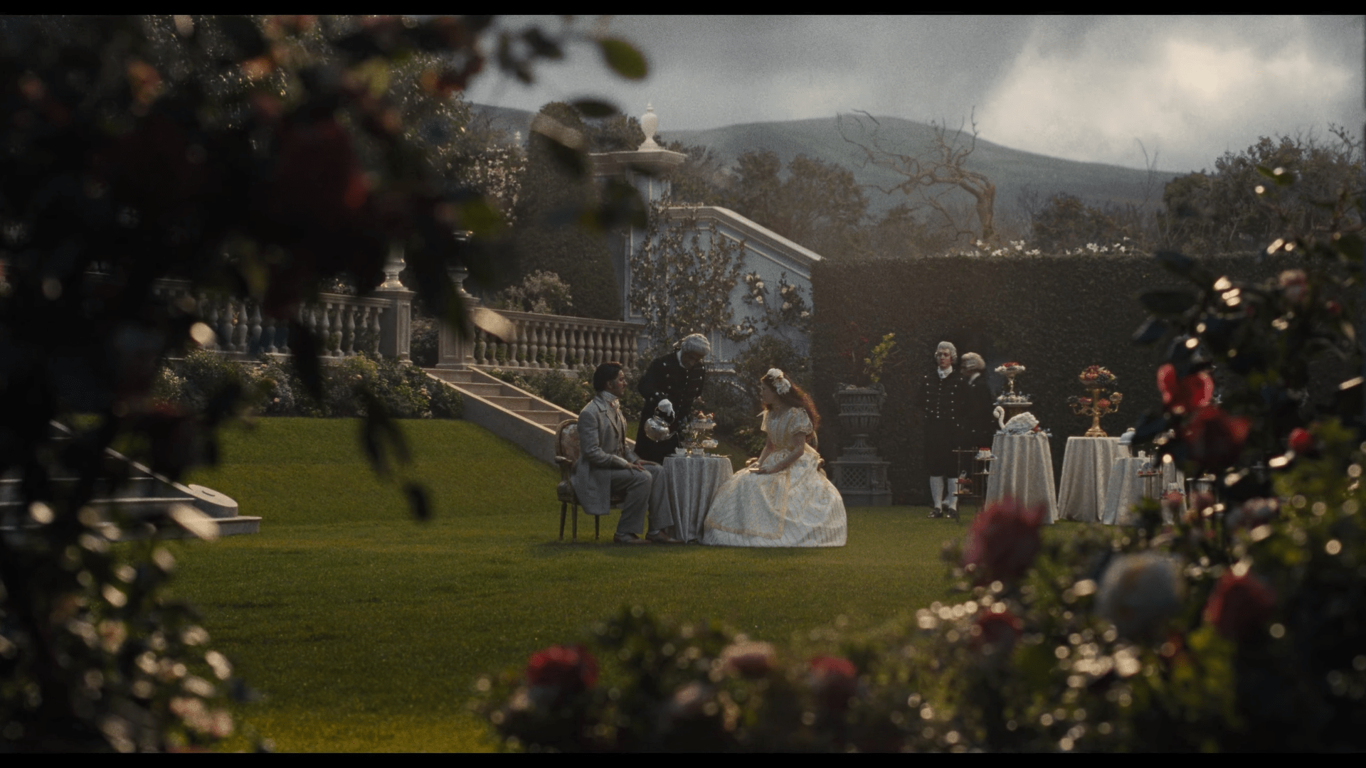 The film’s greatest struggle is tonal confusion. It never fully commits to being ethereal, gothic, or romantic, instead drifting awkwardly between mist-covered melancholy and strangely bright, almost fairy-tale-like presentation. Moments of heavy fog and brooding atmosphere clash with bursts of color and music that feel closer to Disney-style romanticism than windswept tragedy. This inconsistency of Emerald Fennell’s direction extends to the score, which oscillates between eerie, horror-leaning textures reminiscent of gothic cinema and glossy pop-infused melodies. Rather than deepening emotion, the music frequently disrupts immersion, making the emotional landscape feel uncertain and thematically scattered.